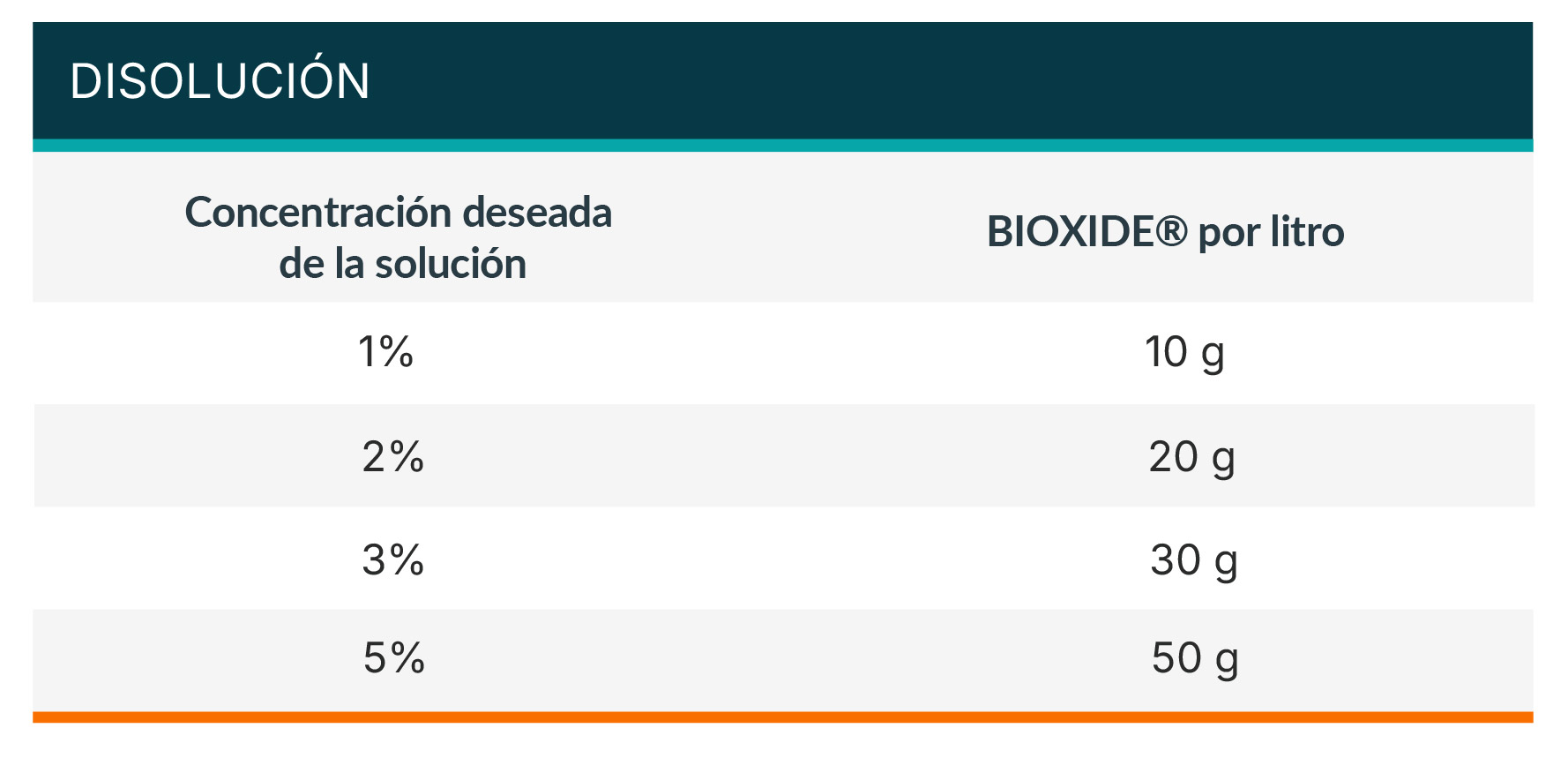 * Se recomienda utilizar la solución dentro de 30 días después de su preparación para aprovechar del mejor desempeño del producto. Las soluciones de BIOXIDE® al 1 % pierden aproximadamente 20 % de su fuerza dentro de 14 días.