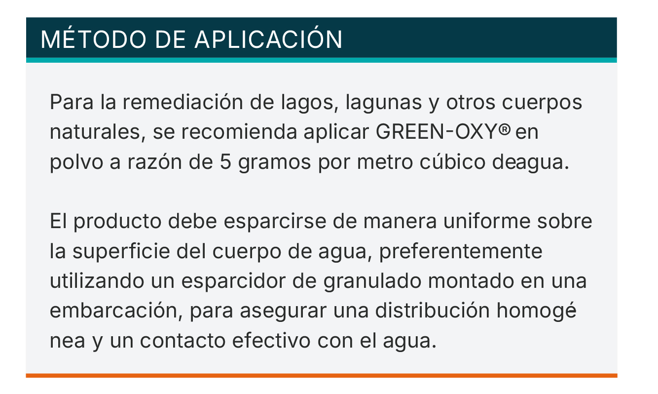 GREEN-OXY® es un oxidante sólido en polvo que proporciona liberación controlada y sostenida de oxígeno en cuerpos de agua, promoviendo un ambiente adecuado para la vida acuática y la recuperación de ecosistemas acuáticos.
